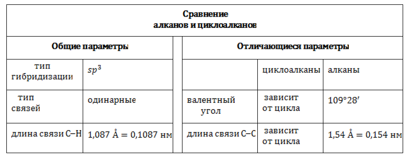 Сходство циклопарафинов с алканами проявляется в полном насыщении углеродного скелета молекулы водородом. Оно возникает благодаря тому, что каждый атом углерода формирует по четыре одинарных связи: либо и в соединениях с боковыми углеводородными цепочками. Это указывает на тип гибридизации углерода в циклоалканах: sp3.