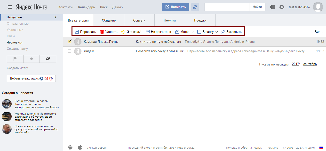 По умолчанию основной страницей Яндекс.Почты является папка Входящие. Чтобы ответить на письмо, его нужно открыть. Для работы с письмами в данной папке также есть специальное меню: