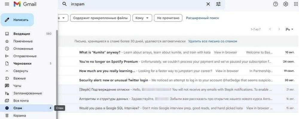 - В папку Спам попадает нежелательная почта, содержащая навязчивую рекламу и потенциальные угрозы, однако, иногда алгоритмы ошибаются и туда попадают важные письма. Поэтому время от времени папку Спам лучше просматривать.