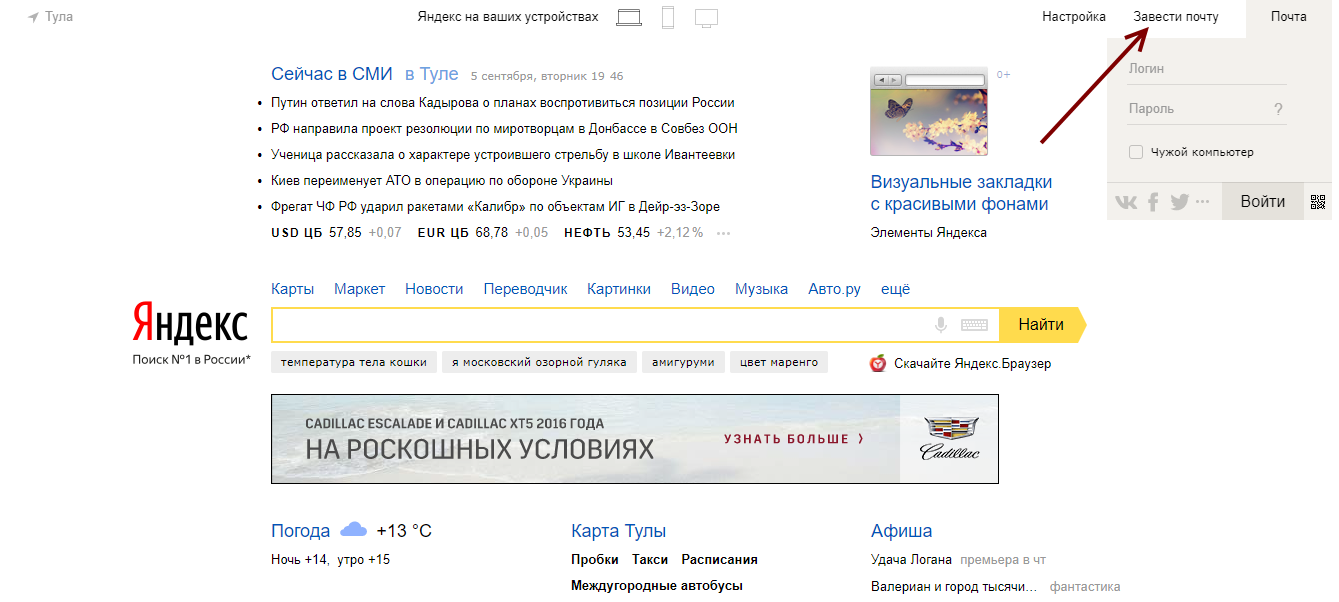 - Первым делом выберите сервис, на котором вы хотите создать свою электронную почту (yandex.ru, rambler.ru, mail.ru и так далее). Зайдите на этот сайт. Найдите слово “почта”. Для пользователей, которые уже имеют e-mail здесь, предложена форма для введения логина и пароля. А для вас рядом – “завести почтовый ящик” или что-либо подобное.