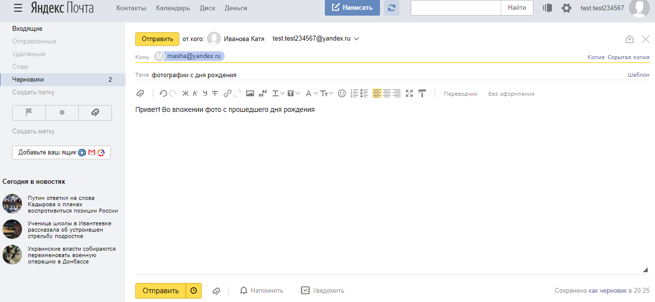 - Затем в профиле своей почты Вася нажимает кнопку «Написать» (или что-то в этом роде, на сервисах её название варьируется); в строке «Кому» указывает адрес получателя, то есть своей подруги – ira@yandex.ru (в полном формате название@доменное имя!); в строке «Тема» набирает заголовок письма, далее – текст письма; нажимает кнопку «Отправить».
