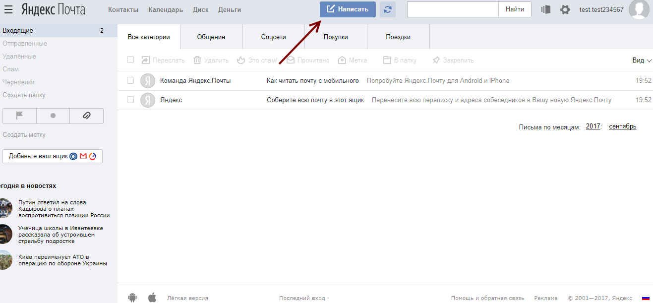 Чтобы написать новое письмо надо нажать кнопку «Написать».