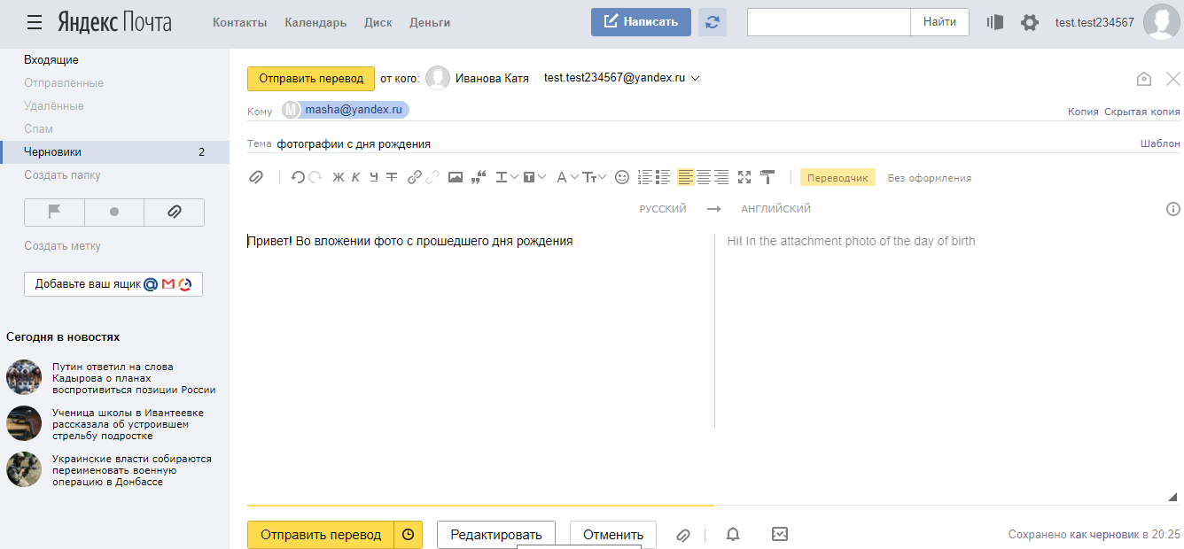 При написании письма можно воспользоваться встроенным редактором для оформления текста. Также можно воспользоваться встроенным переводчиком: