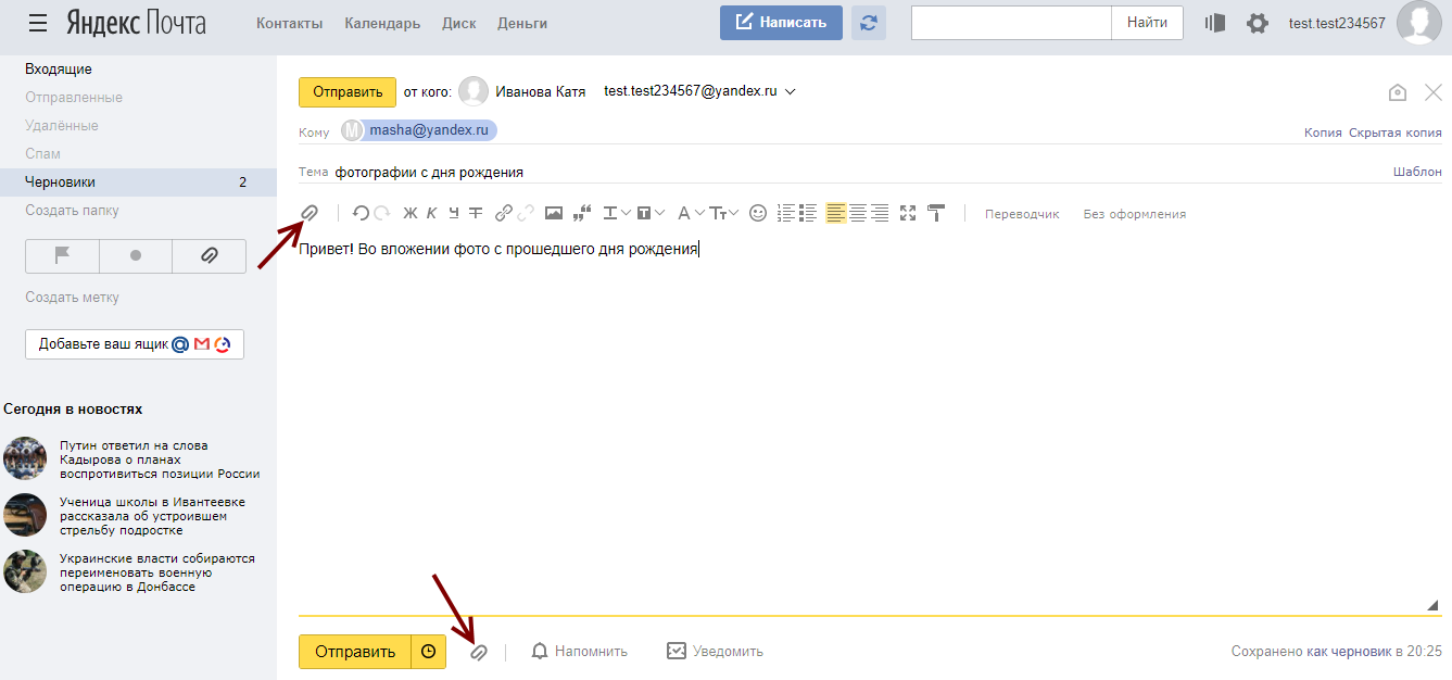 Чтобы прикрепить к письму какой-либо файл, нужно нажать на специальную кнопку в виде скрепки: