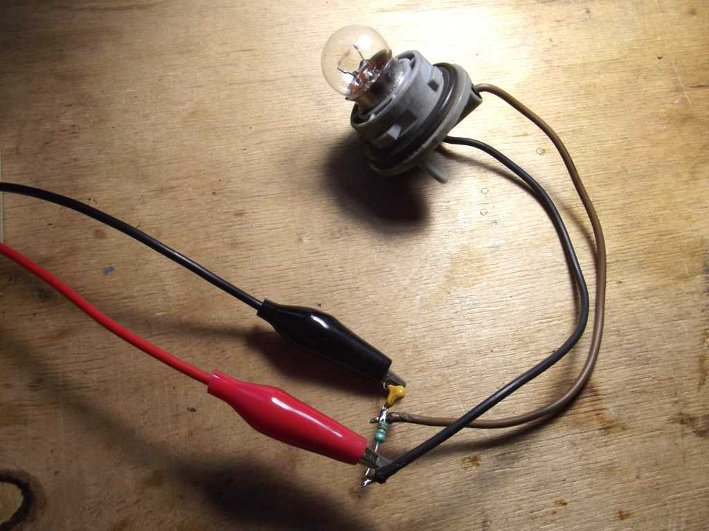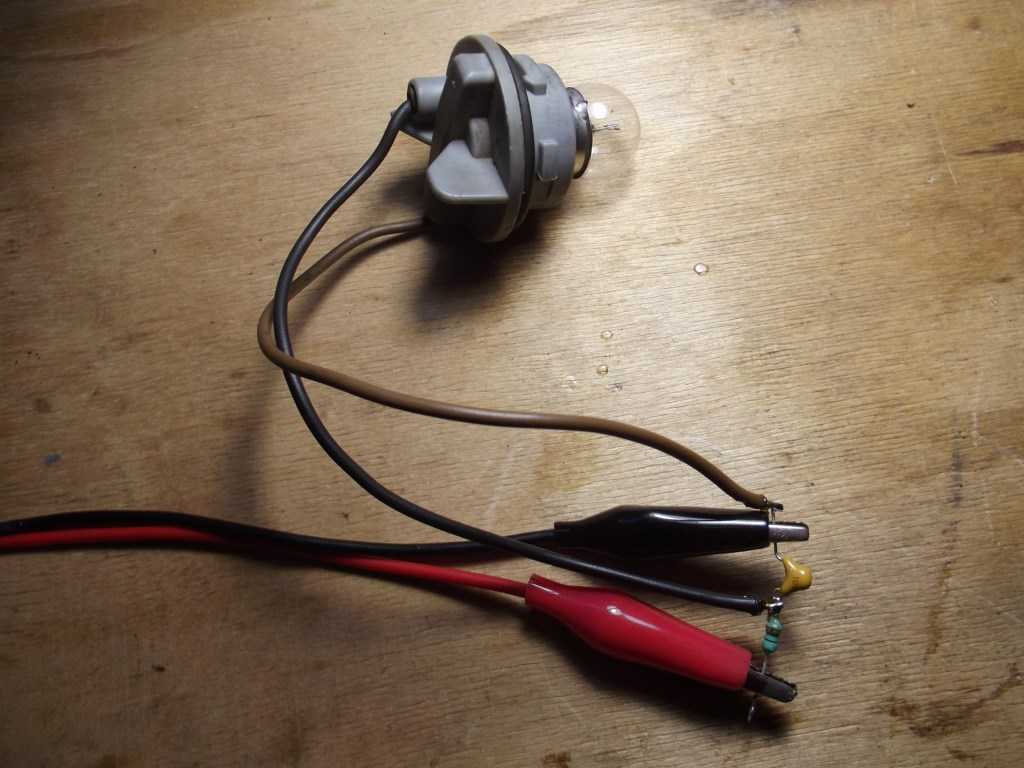 Ну ладно раз такое дело… беру лампочку от мопеда на 12 Вольт и цепляю ее к конденсатору или катушке. Лампочке ведь вроде как по-барабану на какой частоте работать и какой ток кушать. Выставляю амплитуду, чтобы на катушке или конденсаторе было где то Вольт 20 так как среднеквадратичное напряжение будет где-то Вольт 14, и цепляю поочередно к ним лампочку:
