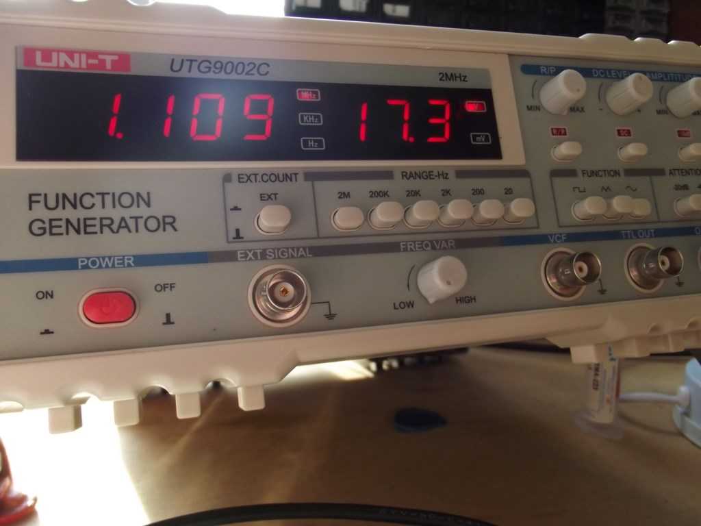 Так как мой генератор частоты китайский и маломощный, то при резонансе у нас в цепи остается только активное сопротивление потерь R. В сумме получается все равно маленькое значение сопротивления, поэтому ток при резонансе достигает максимальных значений. В результате этого, на внутреннем сопротивлении генератора частоты падает приличное напряжение и выдаваемая амплитуда частоты генератора падает. Я буду ловить минимальное значение этой амплитуды. Следовательно это и будет резонанс колебательного контура. Перегружать генератор — это не есть хорошо, но что не сделаешь ради науки!