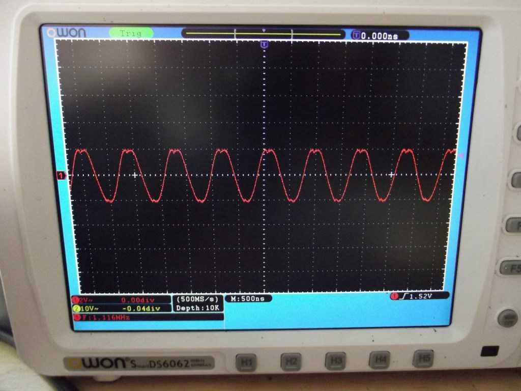 Как видите, мой генератор не в силах выдать большую силу тока в колебательный контур на резонансной частоте, поэтому сигнал получился даже чуть искаженным на пиках.