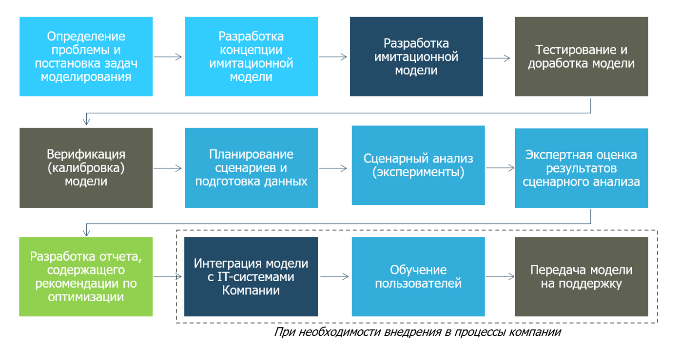 Проведение имитационного моделирования подразумевает выполнение 4 ключевых этапов: