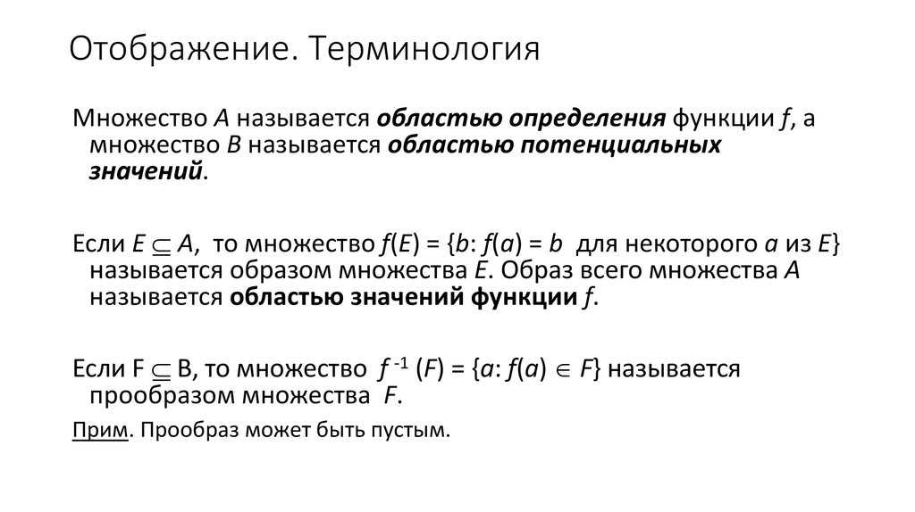 - Изображение и предварительное изображение — b является изображением a, а a является предварительным изображением b, если f (a) = b.