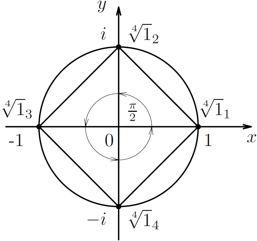 Пример. Найдем по формулам $\sqrt1=\{1,\mathbf i ,-1,-\mathbf i \}$. Эти точки