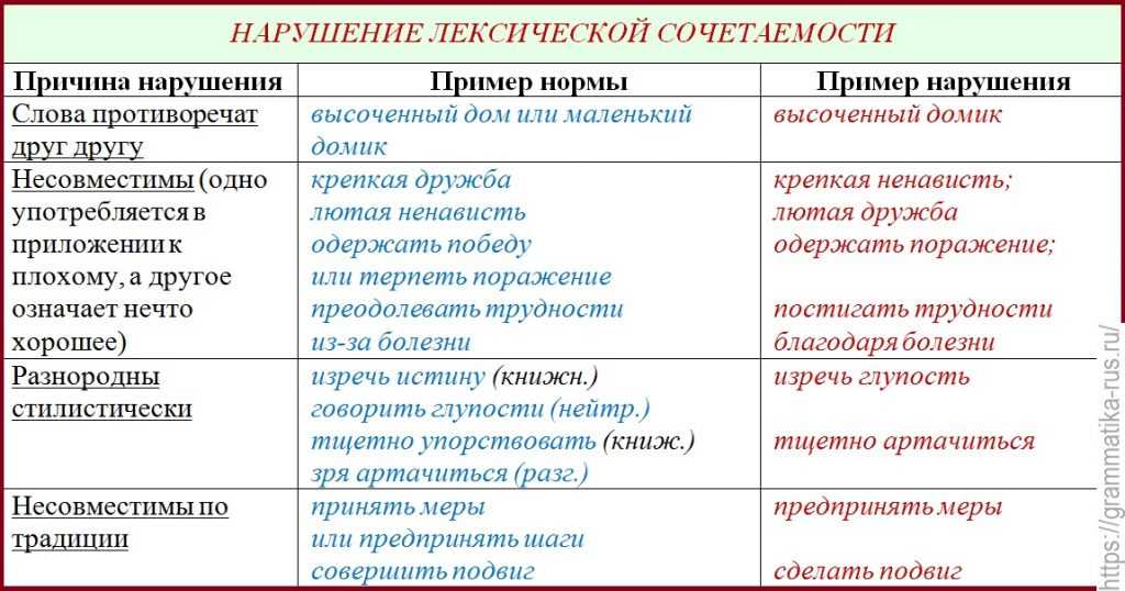 Слова противоречат друг другу высоченный домик вместо высоченный дом или маленький домик Несовместимы (одно употребляется в приложении к плохому, а другое означает нечто хорошее) крепкая ненависть можно крепкая дружба лютая дружба можно лютая ненависть одержать поражение можно одержать победу или терпеть поражение постигать трудности можно преодолевать трудности благодаря болезни можно из-за болезни Причиной ошибок является контаминация . Она возникает при путанице похожих словосочетаний. Так, из «удовлетворять требования» и «отвечать потребностям» появилось «удовлетворять потребностям» » (вместо «удовлетворять ЧТО? – потребности»)