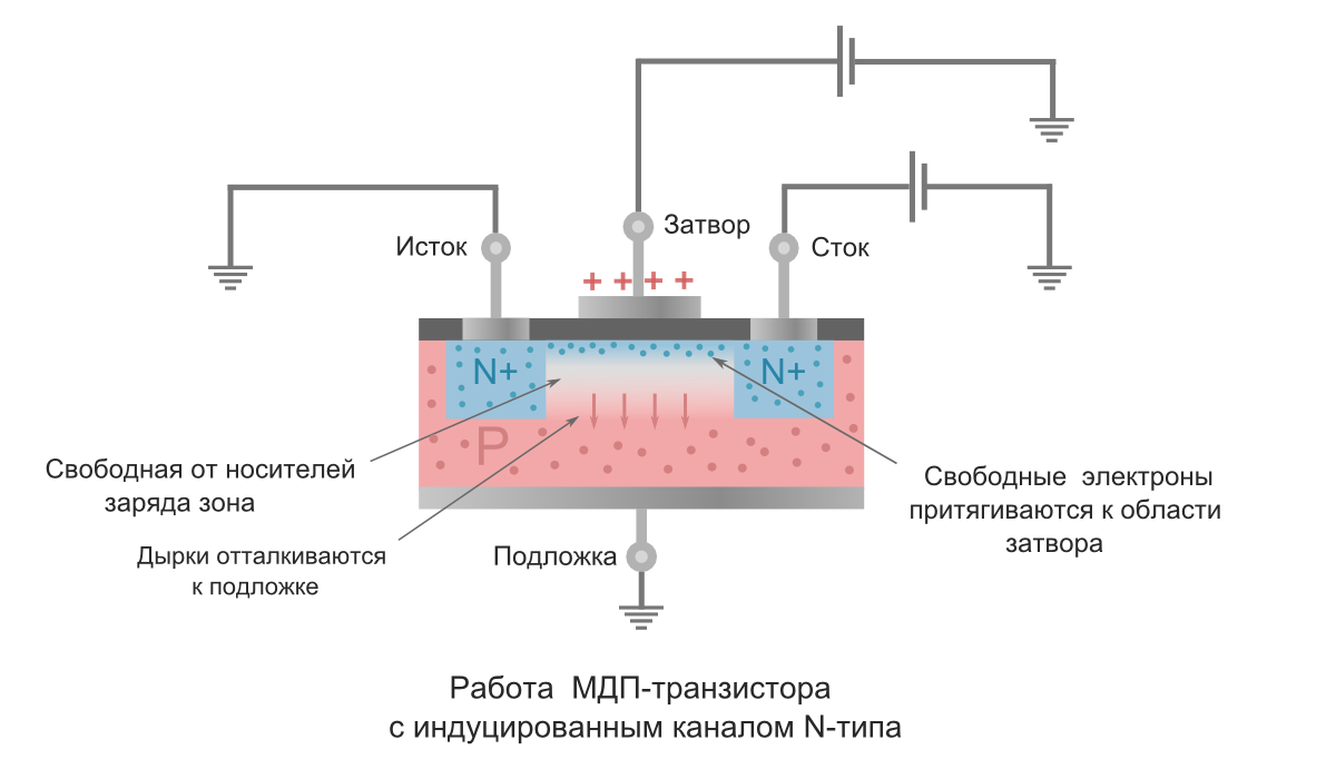 Работа МДП-транзистора (MOSFET) с индуцированным каналом N-типа.