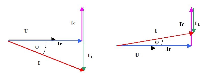 При параллельно соединении элементов RLC напряжение на всех элементах действует одно и то же, а токи разные, чем меньше сопротивление ветви, тем больше ток. В первом случае ток катушки значительно больше тока конденсатора. Вектор общего тока направлен вниз. Во втором случае ток катушки значительно меньше тока конденсатора и вектор тока направлен вверх.