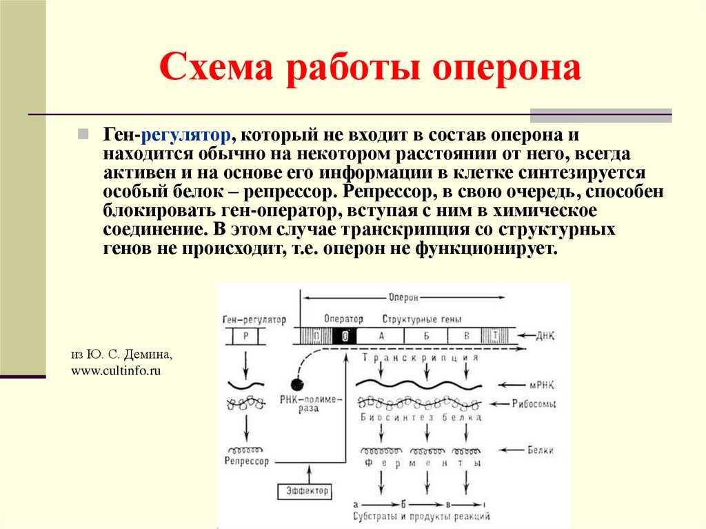 На основе информации гена-регулятора синтезируется белок-репрессор; если он активный, он связывается с геном-оператором, перекрывая путь для РНК-полимеразы – процесс трансляции и последующего синтеза белка выключается (запрещается). Если появляется индуктор (например, лактоза в lac-опероне), он присоединяется с белку-репрессору, приводя его в неактивное состояние.