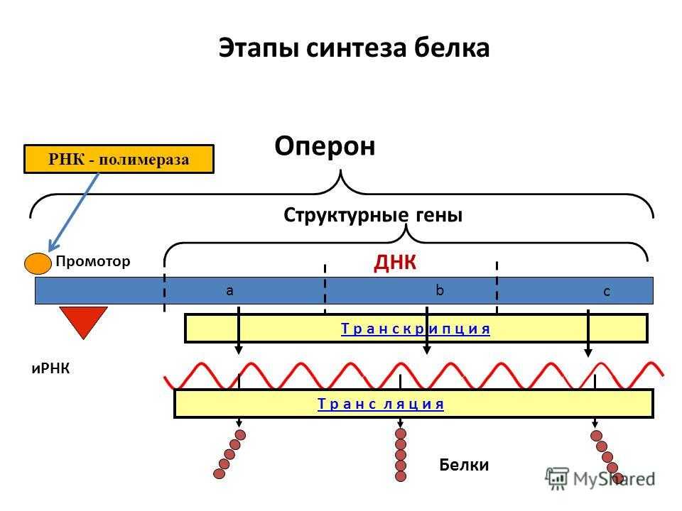 С промотором соединяется фермент РНК-полимераза, осуществляющий синтез мРНК. Другой элемент, управляющий процессом транскрипции, – оператор, который располагается поблизости от промотора или внутри него. Этот участок может быть свободным, тогда РНК-полимераза соединяется с промотором и начинается транскрипция. Если оператор связан с белком-репрессором, РНК-полимераза не может нормально соединиться с промотором, и транскрипция невозможна.