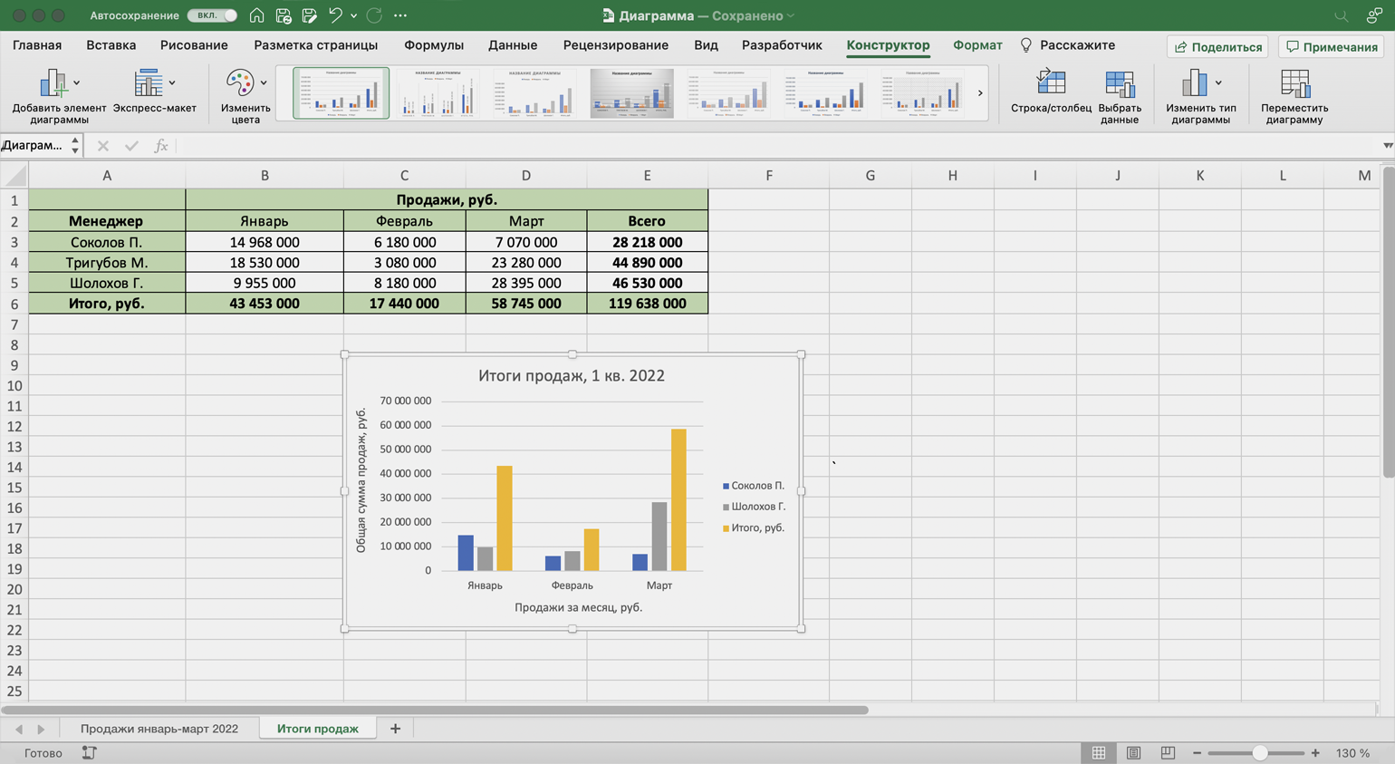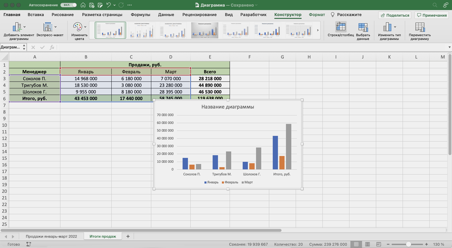 В таком виде диаграмма работает лучше. На ней видно, что больше всего продаж в автосалоне было в марте, а меньше всего — в феврале. При этом продажи каждого менеджера и итог продаж за месяц можно отследить по цветам.