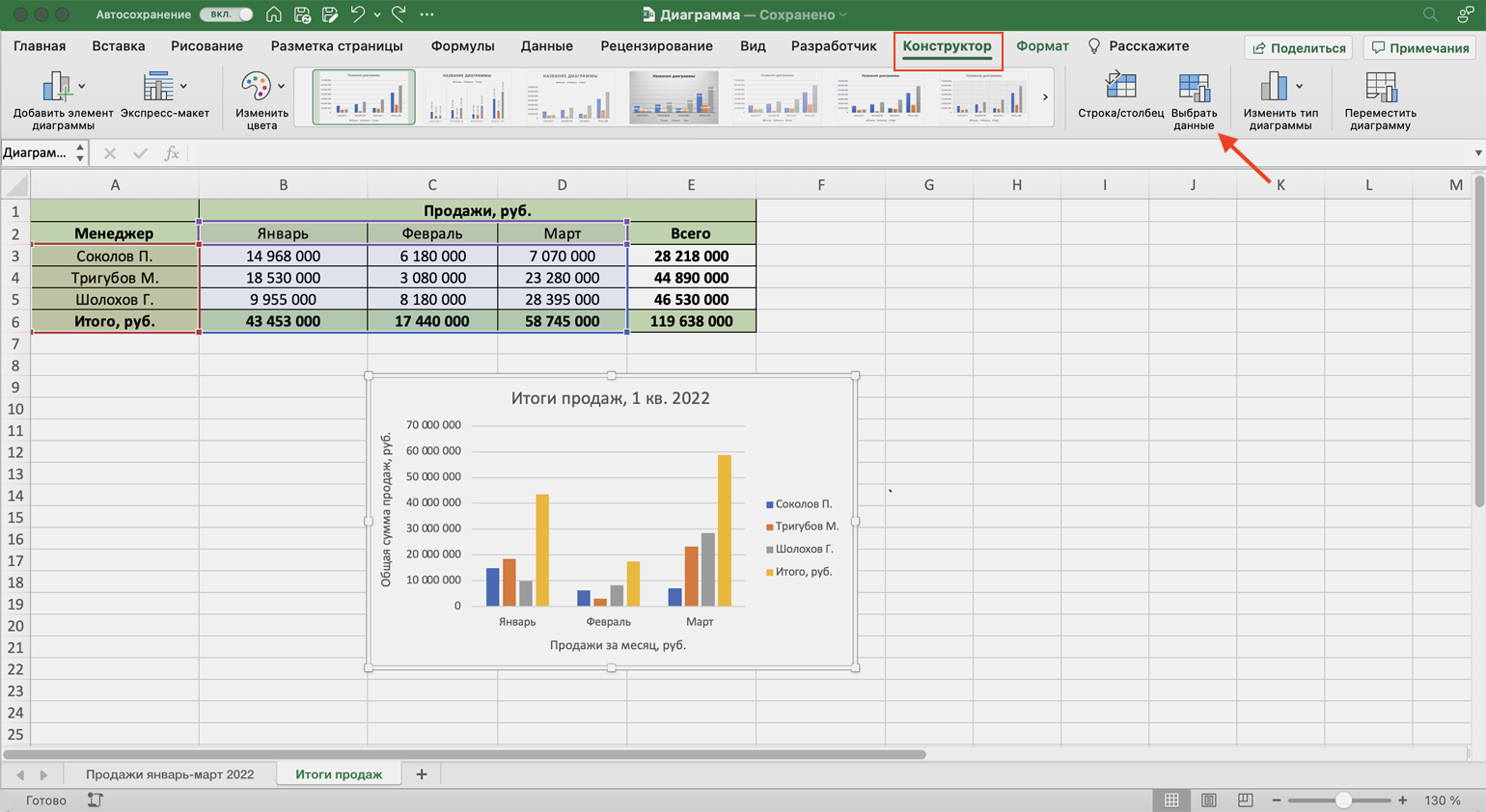 Выделим построенную диаграмму и перейдём во вкладку «Конструктор». В ней нажмём кнопку «Выбрать данные».