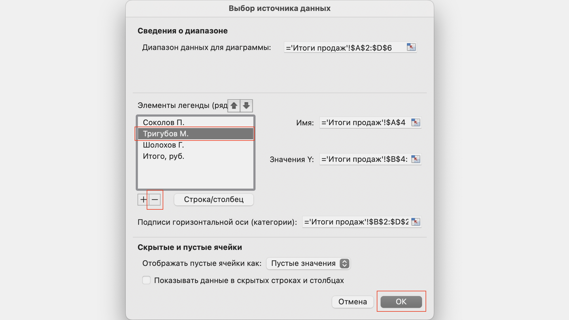 В появившемся окне в поле «Элементы легенды» удалим одного из менеджеров — выделим его фамилию и нажмём значок –. После этого нажмём «ОК».