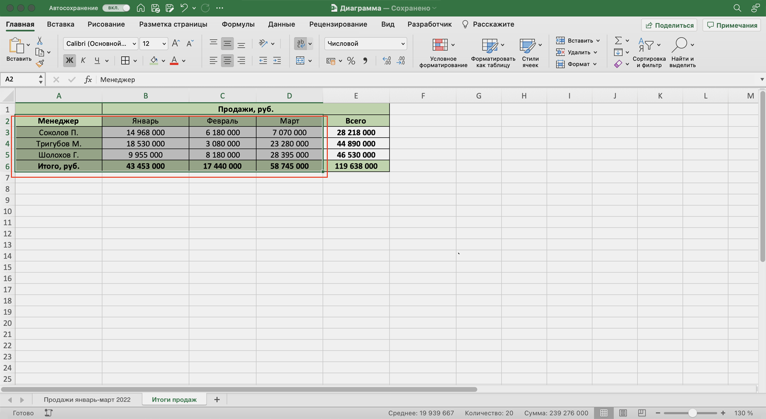 Построим гистограмму. Снова выделим столбец с фамилиями менеджеров и три столбца с ежемесячными продажами, включая строку «Итого, руб.». На вкладке «Вставка» выберем пункты «Диаграмма» → «Гистограмма».