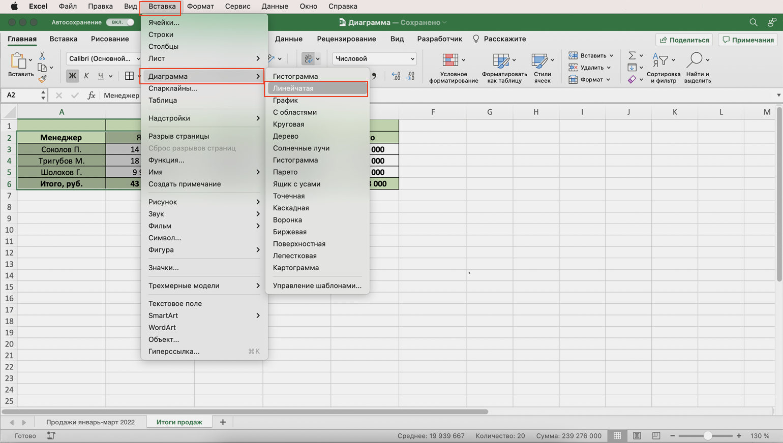 Теперь построим диаграммы, на которых будут видны тенденции квартальных продаж салона — в каком месяце их было больше, а в каком меньше — с разбивкой по менеджерам. Для этого подойдут линейчатая диаграмма и гистограмма.