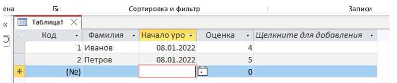 Под созданными именами полей располагаются пустые строки – записи. Активная в данный момент запись отмечается цветным маркером.