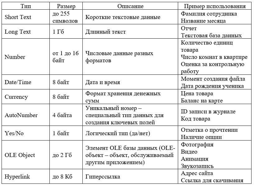 Основные типы данных СУБД Access, их описание и примеры использования приведены в таблице.
