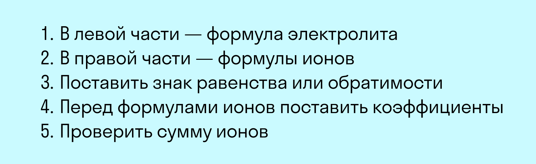 В левой части пишем молекулярную формулу вещества, а в правой — формулы образовавшихся катионов и анионов. Между ними ставим знак =, если это сильный электролит, или знак ⇄ — если средний или слабый. После этого нужно проставить коэффициенты перед ионами и проверить сумму катионов и анионов (она всегда равна 0).
