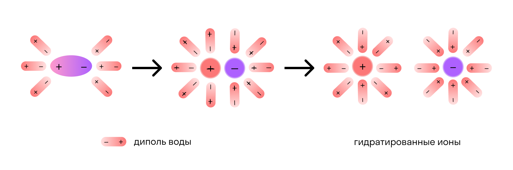 Между ионами электролита и диполями воды возникают силы взаимного притяжения. В результате связь между ионами ослабевает, и происходит переход ионов из кристалла в раствор. Очевидно, что последовательность процессов, происходящих при диссоциации веществ с ионной связью (солей и щелочей), будет такой: