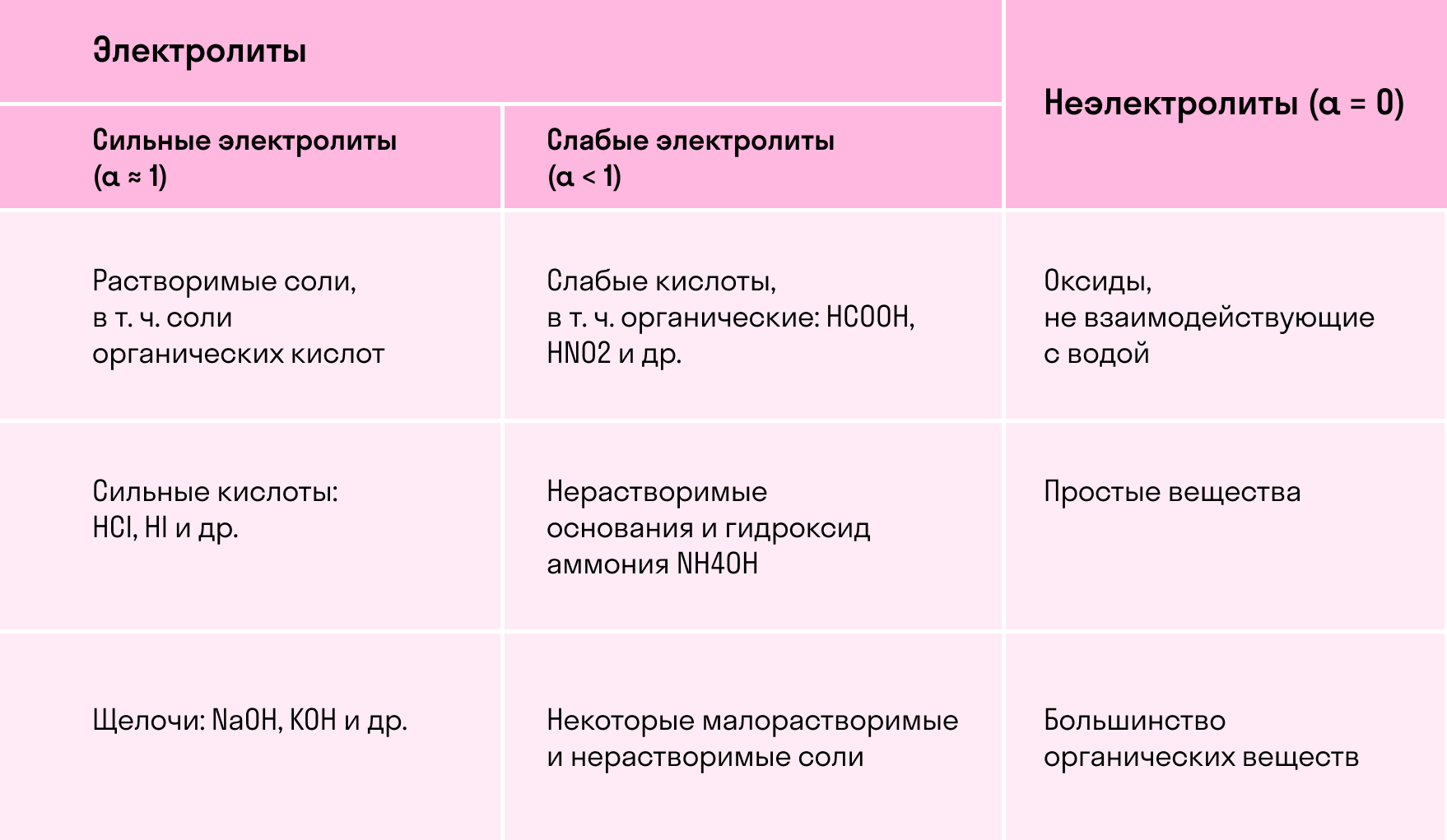 В зависимости от того, сколько молекул диссоциировало на ионы, вещество может быть сильным или слабым электролитом. Этот показатель называется степенью диссоциации, его измеряют от 0 до 1 либо в процентах.