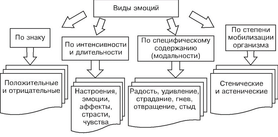 - По интенсивности и длительности: эмоции, чувства, настроение и др.