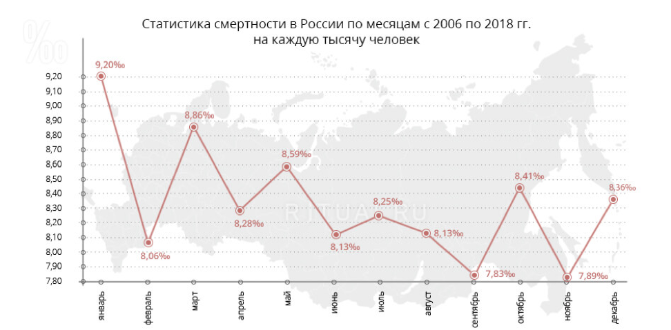 Но если отталкиваться от официальной статистики Росстата, основное количество умерших в России приходится на зимнюю декаду. Особенно здесь отличается январь. В среднем за этот месяц фиксируется 9,2 – 9,5 % всех смертей. Возможно, такой рост связан с длительными новогодними праздниками, сопровождающимися чрезмерным употреблением спиртного и еды. Если к этому добавить холода на основной части России, возникают существенне предпосылки для обострения хронических заболеваний.