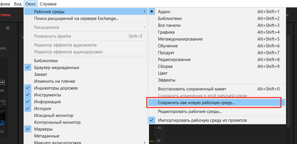 Когда интерфейс примет нужный вам вид, можно сохранить его, чтобы при следующем открытии программы все элементы точно были на своих местах. Сохранять конфигурацию можно с помощью опции «Сохранить как новую рабочую среду» в пункте меню «Окно» — «Рабочие среды».
