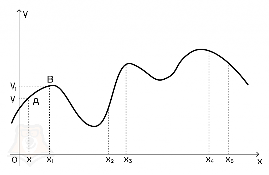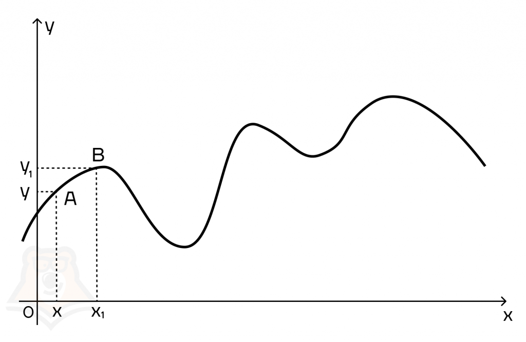 Отложим на нашем графике две точки: х и х1 и поднимем из них прямые, которые пересекут график в точках А и В. Тогда точка А будет иметь координаты (х;у), а точка В — (х1;у1).