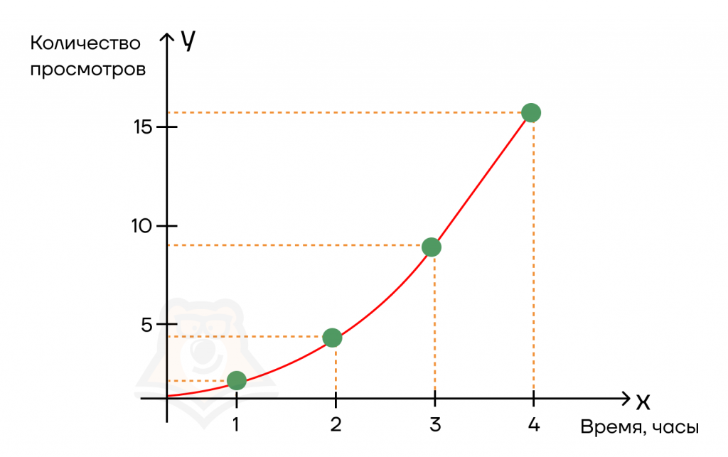 Как с помощью производной оценить рост популярности видео в соцсети?Допустим, мы выложили видео в соцсеть. Сначала было совсем невесело: за первый час всего один просмотр. За второй час ситуация сильно не изменилась — добавилось лишь 3 просмотра. Мы скинули ссылку на видео в чат друзей, и за третий час количество просмотров дошло до 9, а за четвертый час — до шестнадцати. Возможно, ситуация не очень похожа на правду, и мы бы сразу попали в топ. Но пусть будет так для удобства цифр. В результате мы имеем функцию, которая показывает, как количество просмотров менялось во времени. Теперь зададимся вопросом: как быстро росла популярность у нашего ролика?Чтобы это выяснить, мы возьмем две соседние точки на графике и посчитаем:1) как изменилось количество просмотров между этими точкам (Δ количества просмотров);2) как изменилось время между этими точками (Δ времени);3) затем разделим Δ просмотров на Δ времени. Получается, что “производительность” нашего видео была 5 просмотров в час. Таким нехитрым образом, мы нашли производную от функции, показывающую рост популярности нашего ролика в сети за определенный промежуток времени:\(f'(x) = \frac{\Delta y}{\Delta x} = \frac{5}{1} = 5\)(просмотров в час) |