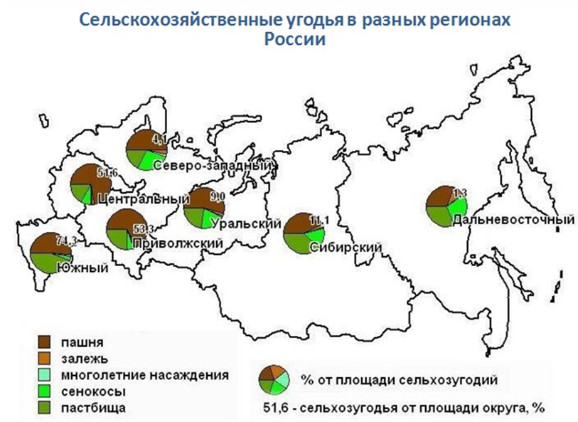 Земли, которые предназначены для ведения сельского хозяйства, называются сельскохозяйственными угодьями. Россия находится на 5 месте в мировом рейтинге по количеству таких земель. Расположились они по территории России неравномерно. Значительная часть таких земель (70%) находится в европейской части.