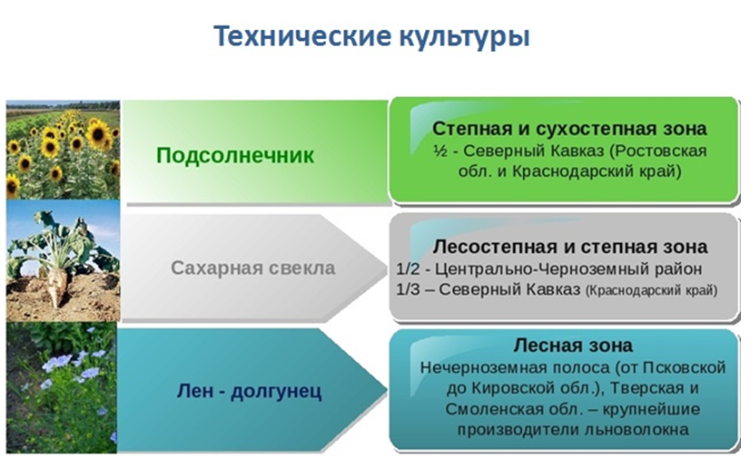 Немаловажное значение среди растениеводства занимают технические культуры. Они занимают меньше посевной площади, однако относятся к более дорогостоящим и трудоемким