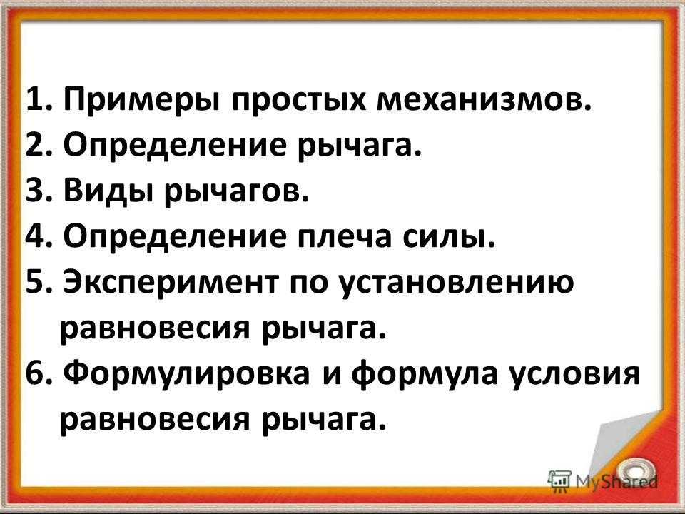 1. Примеры простых механизмов. 2. Определение рычага. 3. Виды рычагов. 4. Определение плеча силы. 5. Эксперимент по установлению равновесия рычага. 6. Формулировка и формула условия равновесия рычага.