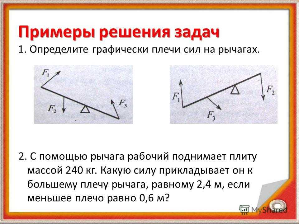 Примеры решения задач Примеры решения задач 1. Определите графически плечи сил на рычагах. 2. С помощью рычага рабочий поднимает плиту массой 240 кг. Какую силу прикладывает он к большему плечу рычага, равному 2,4 м, если меньшее плечо равно 0,6 м?