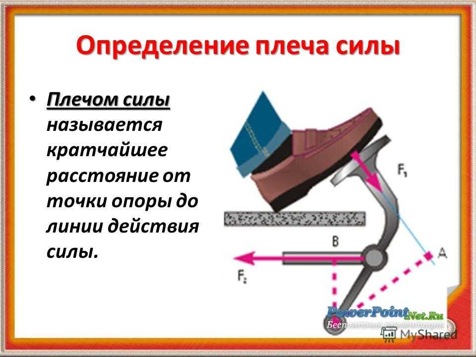 Определение плеча силы Плечом силы Плечом силы называется кратчайшее расстояние от точки опоры до линии действия силы.