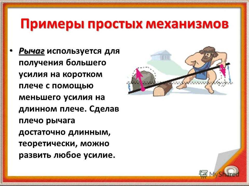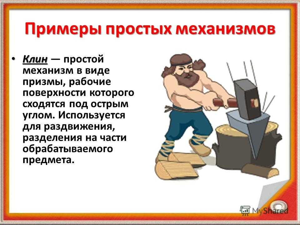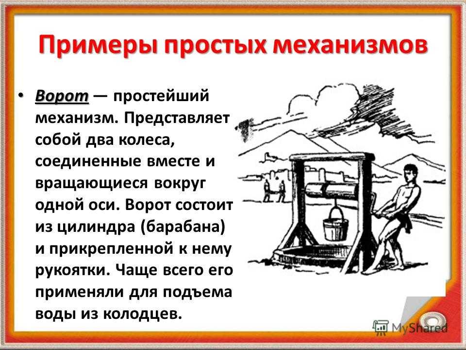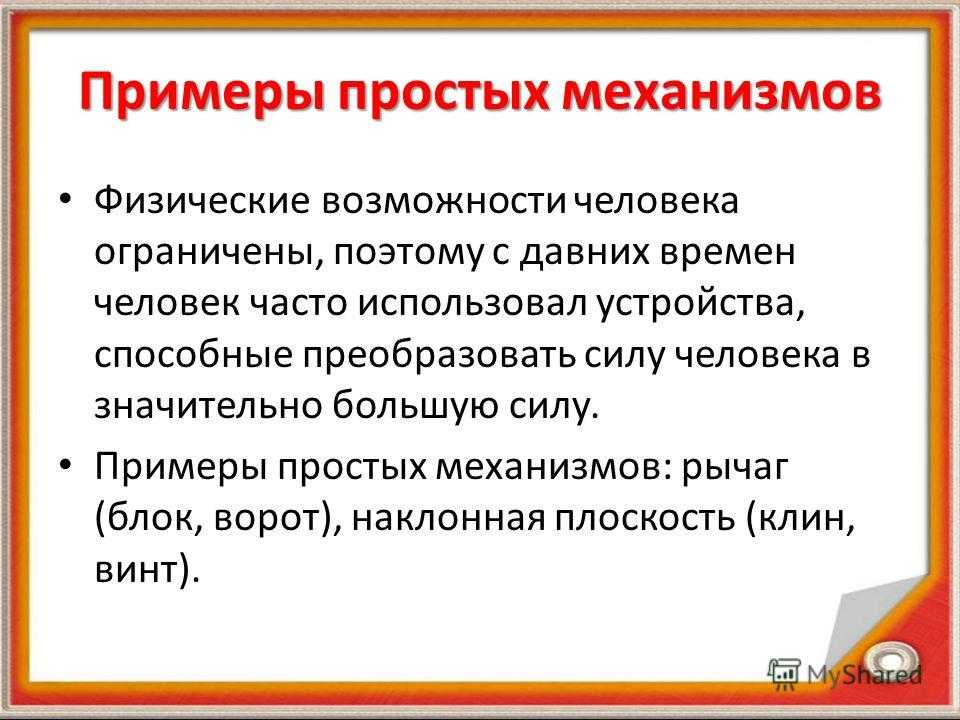 Примеры простых механизмов Физические возможности человека ограничены, поэтому с давних времен человек часто использовал устройства, способные преобразовать силу человека в значительно большую силу. Примеры простых механизмов: рычаг (блок, ворот), наклонная плоскость (клин, винт).