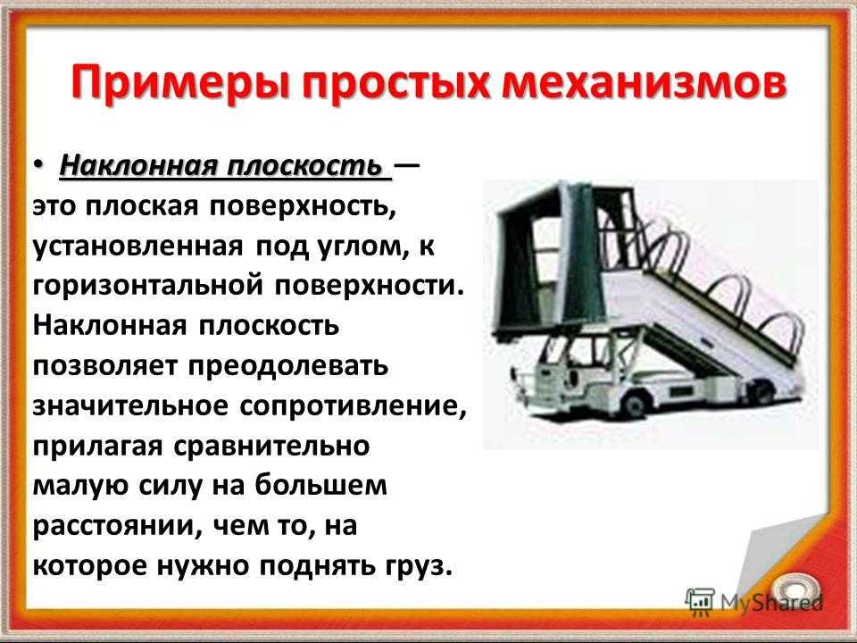 Примеры простых механизмов Наклонная плоскость Наклонная плоскость это плоская поверхность, установленная под углом, к горизонтальной поверхности. Наклонная плоскость позволяет преодолевать значительное сопротивление, прилагая сравнительно малую силу на большем расстоянии, чем то, на которое нужно поднять груз.