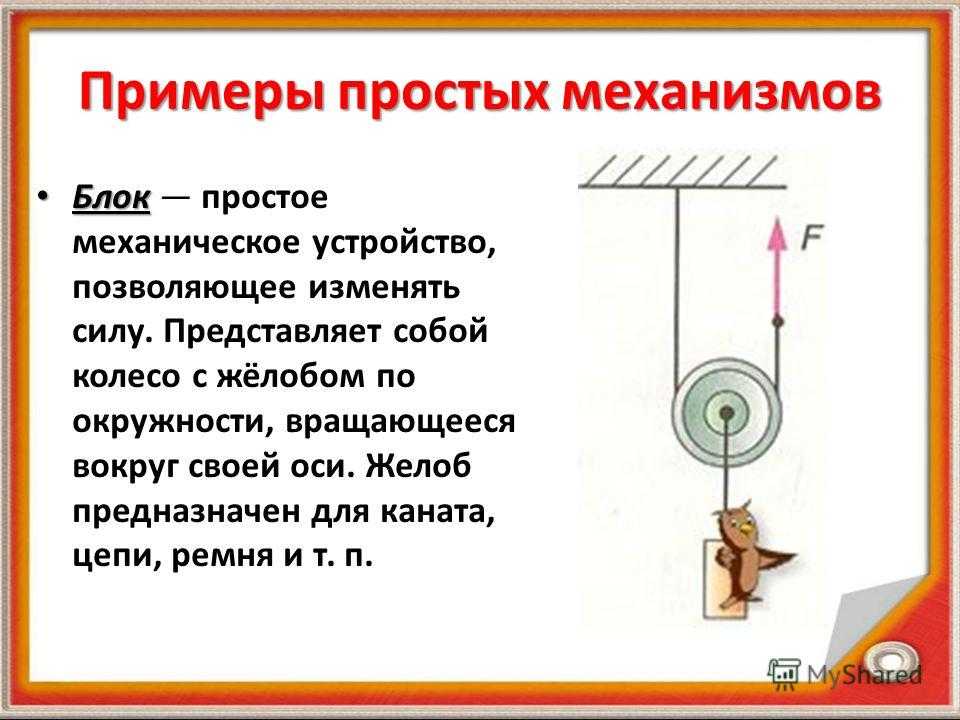 Примеры простых механизмов Блок Блок простое механическое устройство, позволяющее изменять силу. Представляет собой колесо с жёлобом по окружности, вращающееся вокруг своей оси. Желоб предназначен для каната, цепи, ремня и т. п.