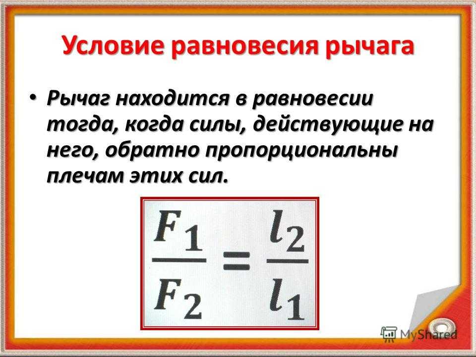 где F1 и F2 – силы, действующие на рычаг,а l2 и l1 – плечи этих сил.