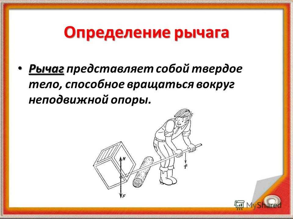 Определение рычага Рычаг Рычаг представляет собой твердое тело, способное вращаться вокруг неподвижной опоры.