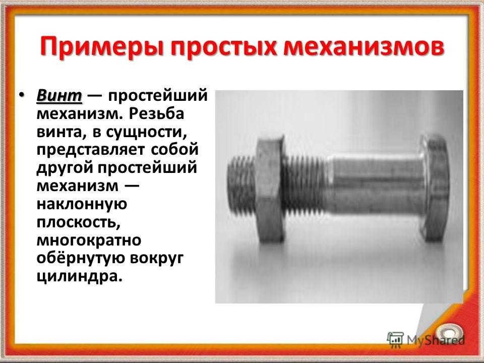 Примеры простых механизмов Винт Винт простейший механизм. Резьба винта, в сущности, представляет собой другой простейший механизм наклонную плоскость, многократно обёрнутую вокруг цилиндра.