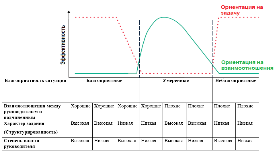 Ф. Фидлером была разработана ситуационная модель лидерства, согласно которой и изменяется ориентация лидерского стиля. По результатам оценки различных ситуационных факторов (степень власти, характер производственных задач, взаимоотношения между руководителем и подчиненными) определяются благоприятные или неблагоприятные ситуации для менеджера, при которых является эффективной ориентация на задачу, и умеренные ситуации, при которых следует сосредоточиться на взаимоотношения (рис.1).