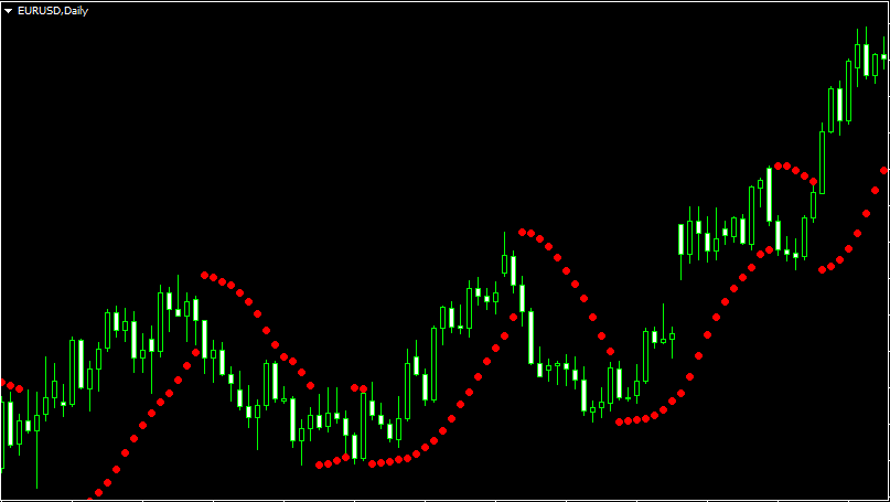 Очень простой в использовании индикатор, который помогает отобразить на графике текущую преобладающую тенденцию. Параболик входит в список стандартных индикаторов в метатрейдере, и находится в разделе “Трендовые”. Чем крупнее используемый тайм-фрейм, тем лучше работает этот инструмент трендового анализа. Представляет собой последовательность точек, каждая из которых соответствует бару. В случае, когда точки расположены ниже графика, можно сказать, что тренд восходящий. Если же над графиком, то цена находится в медвежьей фазе. Это, конечно же, не грааль, но простота использования, несложное и интуитивно понятное отображение сделало его достаточно популярным инструментом трендового анализа.