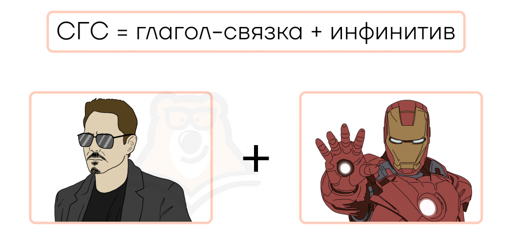 Второй тип — составное глагольное сказуемое (СГС) — отличается только тем, что вместо одного глагола у нас появится несколько: один будет вспомогательным, другой будет выражен инфинитивом и нести основную смысловую нагрузку.