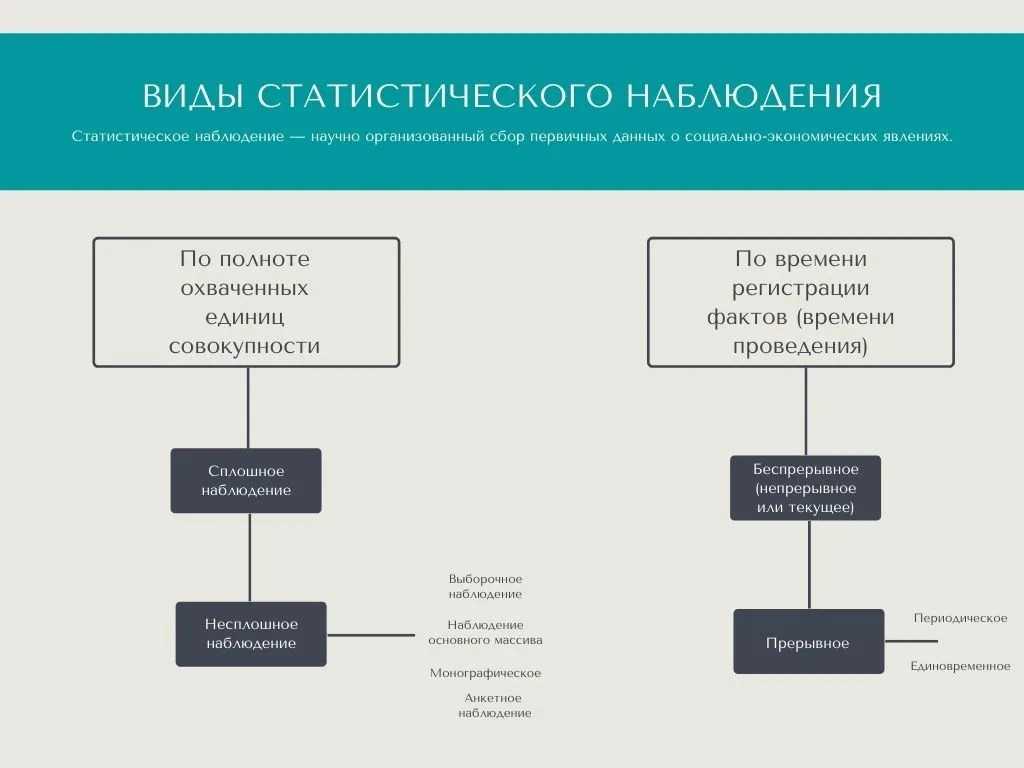 Статистическое наблюдение подразделяется на отдельные виды по следующим признакам: