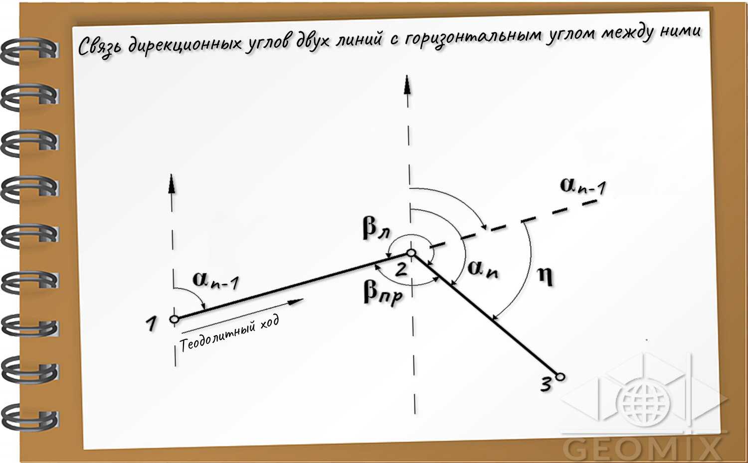 В геодезии за дирекционный угол (\(\alpha \)) принимают угол, который начинают отсчитывать от северного направления осевого меридиана и до заданной стороны. Он измеряется от 0 до 360°. Вычислить его значение для правой стороны хода можно по формуле ниже: